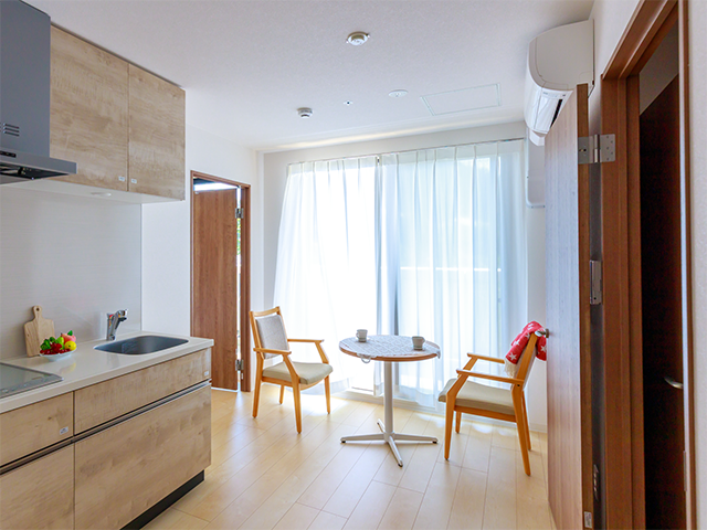 ふれあいの杜さがみ湖は賃貸マンション同様、居室内にバス・トイレ・IHキッチンが設けられ、自立自活した生活ができます。居室の広さは一般的な施設より広い34㎡以上を確保しています。居室内には緊急救急ボタンを配備し、居室内ともに館内はバリアフリーですので、移動も安心です。建物は鉄筋コンクリート造で災害時の非常用電源も完備、館内は定期的な清掃により清潔が保たれています。またエントランスゲートは不審者の侵入を防ぐインターフォン&オートロックを装備し、受付にはコンシェルジュが常駐しています。さらにスタッフによる昼食時巡回とシステム※による安否確認と生活相談サービスを行なっており、安全安心、快適な暮らしのためのさまざまな配慮が施されています。(※セコムホームセキュリティ:感知センサーによる居室内の入居者の動体把握)